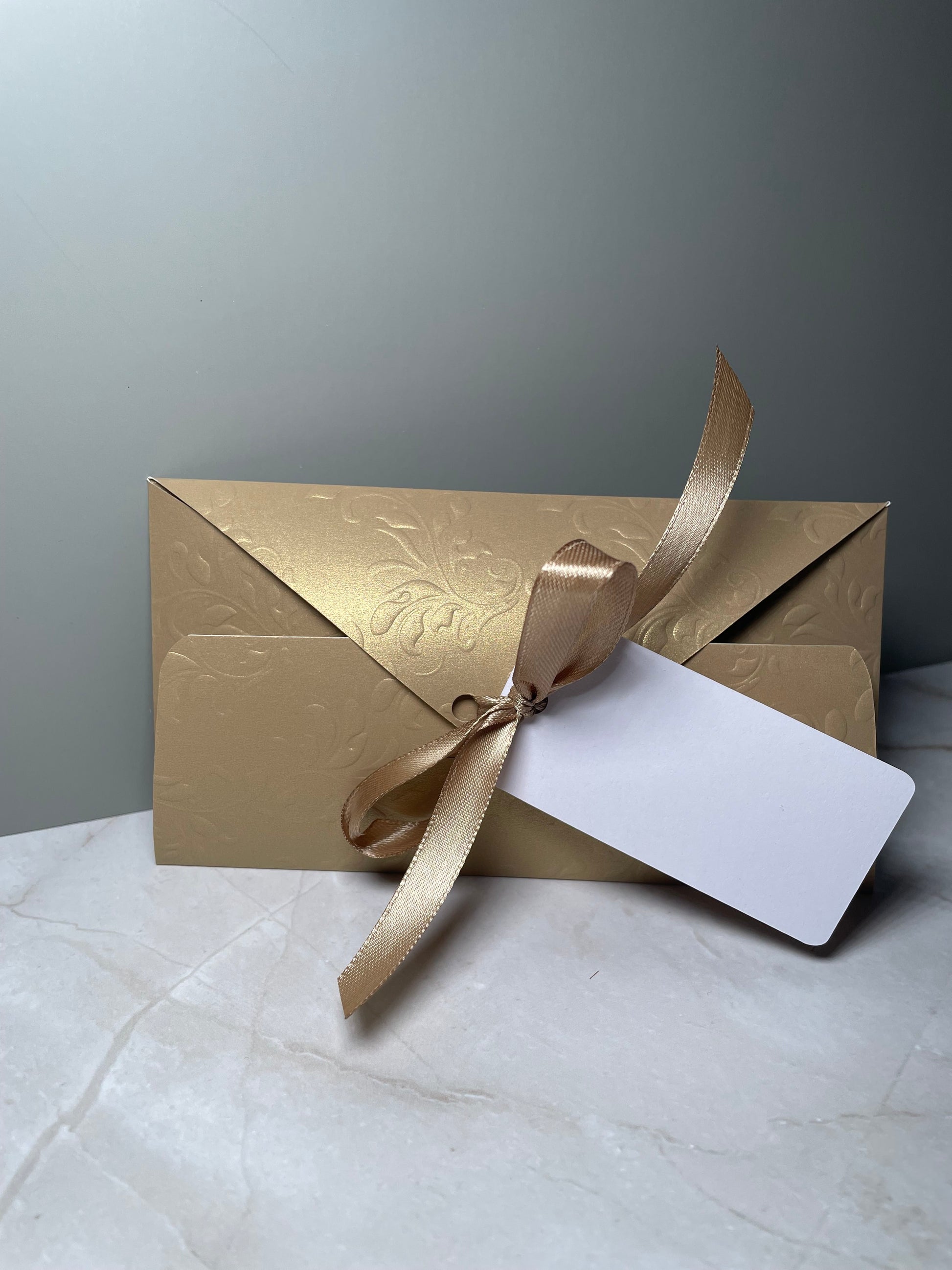 Give your gift in style with this elegant Gold Money Gift Envelope, complete with a beautiful bow tie and matching gift tag. Perfect for gifting cash, vouchers, gift cards, cheques, or heartfelt notes, this luxurious envelope adds a thoughtful and premium touch to any special occasion.